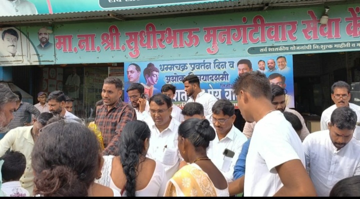 ६९ व्या धम्मचक्र प्रवर्तन दिना व अशोक विजयादशमी निमित्त बौद्ध बांधवांच्या वतीने शहरातून मिरवणूक काढण्यात आली होती. मिरवणूक आमदार सुधीरभाऊ मुनगंटीवार सेवा केंद्राजवळ येताच भाजपाचे जिल्हा महामंत्री विवेक बोढे यांच्या हस्ते शीतपेयाचे व पाणी बॉटलचे वितरण करण्यात आले.